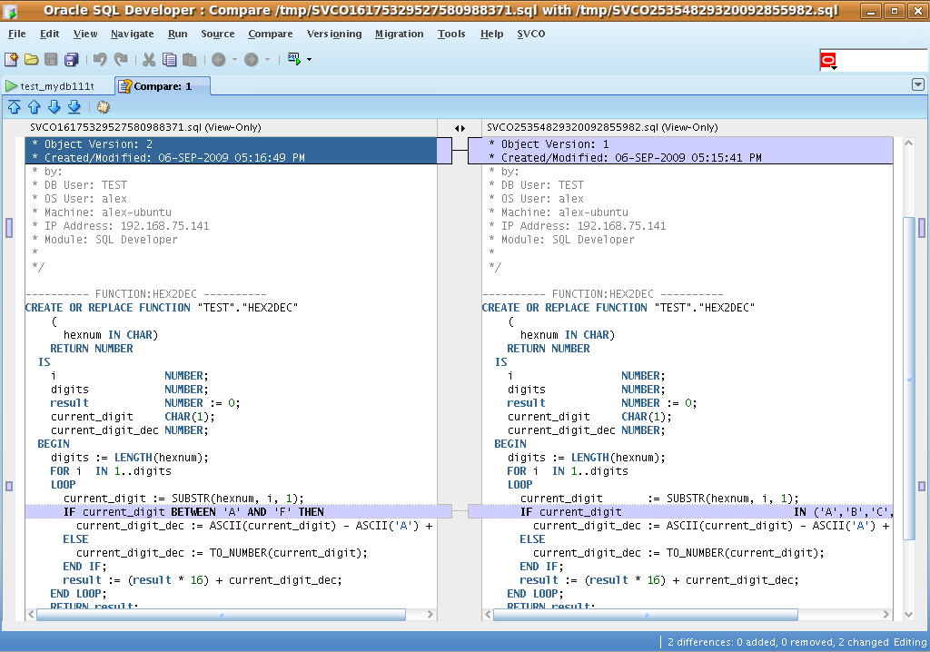 Mark object versions you would like to compare and then in popup menu select Compare Objects DDL.